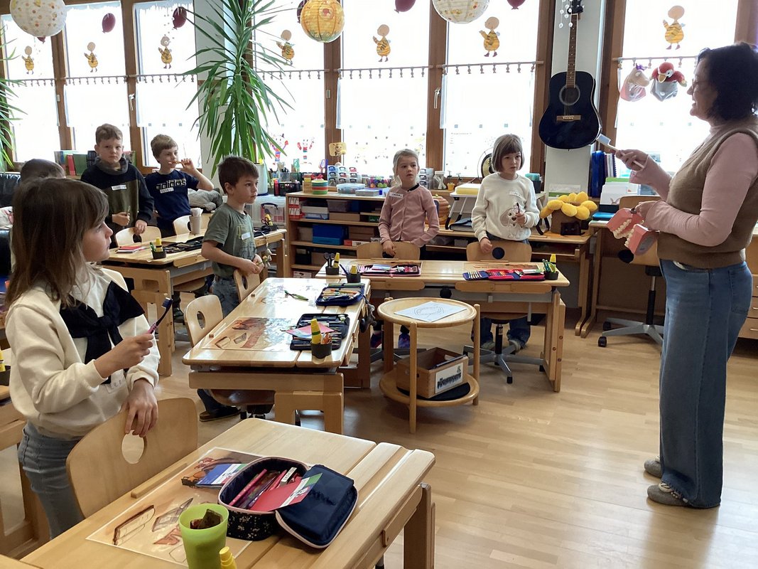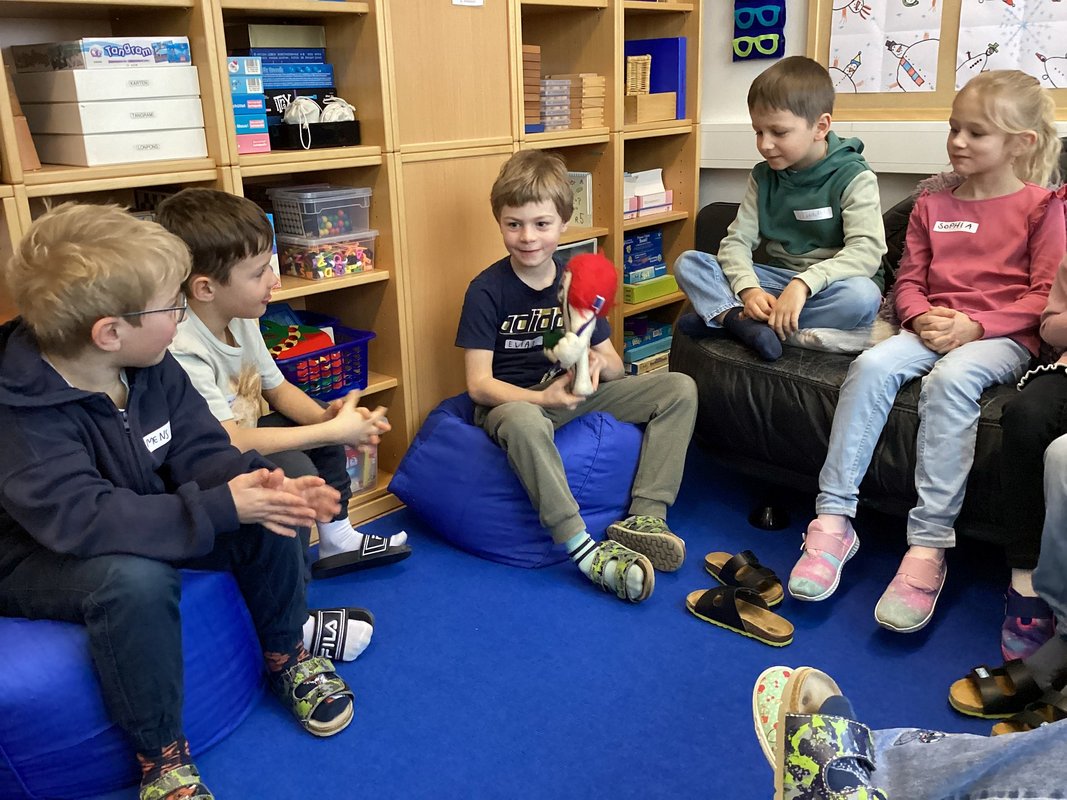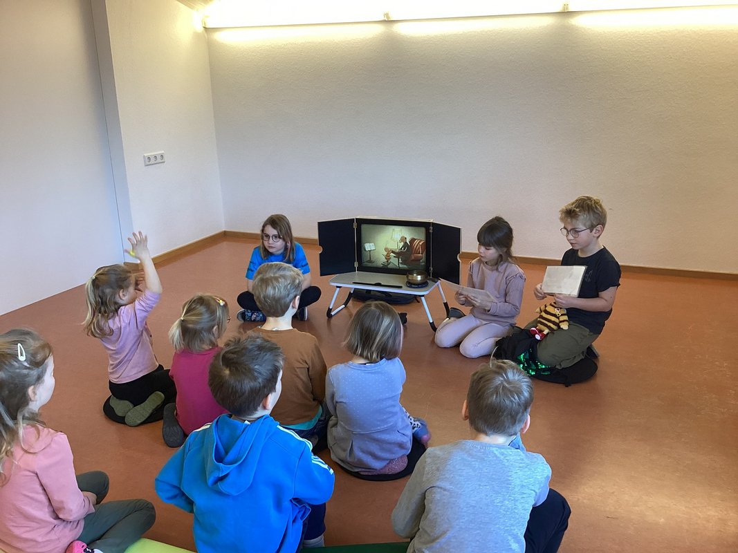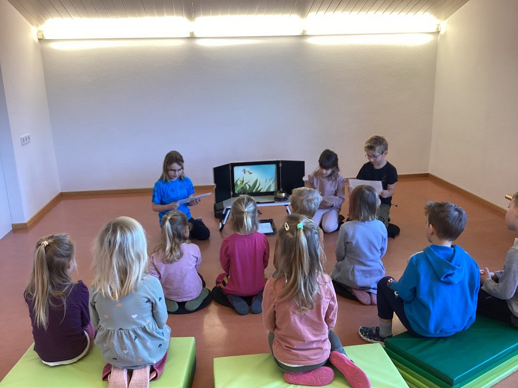 Der 10. März war ein ganz besonderer Tag für uns Schülerinnen und Schüler aus der zweiten Schulstufe! Mit klopfenden Herzen, aber voller Vorfreude machten wir uns auf den Weg in den Kindergarten – und im Gepäck hatten wir etwas ganz Besonderes: ein Kamishibai mit einer unserer Lieblingsgeschichten von der kleinen Hummel Bommel. Im “Kindi” angekommen, wurden wir schon erwartet – viele kleine Gesichter blickten gespannt zu uns hoch und manche rutschten vor Vorfreude hin und her. Wir strahlten stolz, denn schließlich kamen wir als richtige Geschichtenerzähler zu Besuch! Das Kamishibai hatte unsere Lehrerin bereits am Vortag wie eine kleine Bühne aufgebaut. Als wir uns bereit machten, scharten sich die Kindergartenkinder davor uns als der Gong ertönte, der Vorhang sich lüftete, das erste Bild eingeschoben wurde und die kleine Hummel Bommel erschien, konnte man die Begeisterung richtig spüren. Mit klaren Stimmen lasen wir drei Zweitklässler vor, wie Bommel ihren Weg findet, was sie erlebt und wie sie lernt, mutig zu sein. Die Bilder im Kamishibai leuchteten bunt, und die “Kindi-Kinder” hörten uns gespannt zu – niemand wollte auch nur eine Sekunde verpassen. Der Besuch war ein wunderschönes Miteinander: Große, die mutig vorlesen. Kleine, die begeistert zuhören. Und mittendrin die kleine Hummel Bommel, die alle mit ihrer Botschaft verzaubert. Eine Mission voller Mut, Freundlichkeit und Vorlesezauber – ganz wie bei Bommel selbst! Wir drei machten uns anschließend wieder strahlend wie der Sonnenschein auf den Weg in unsere Klasse. Dort erwartete uns unsere Lehrerin, die mächtig stolz auf uns war und ist!