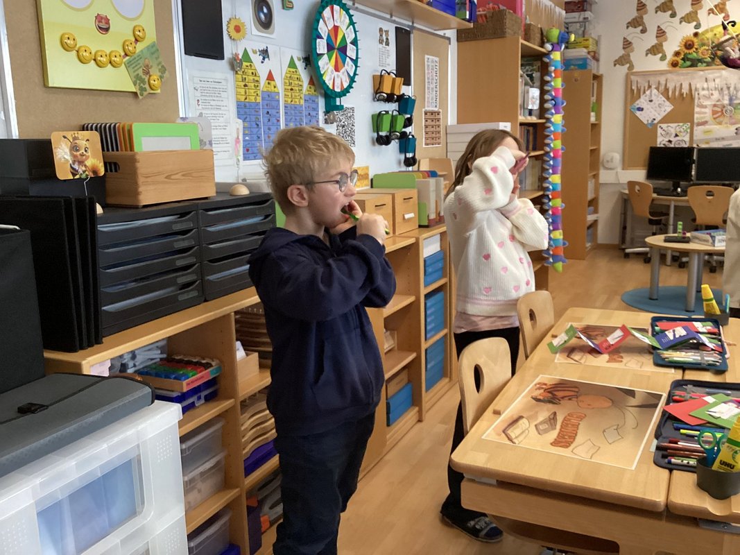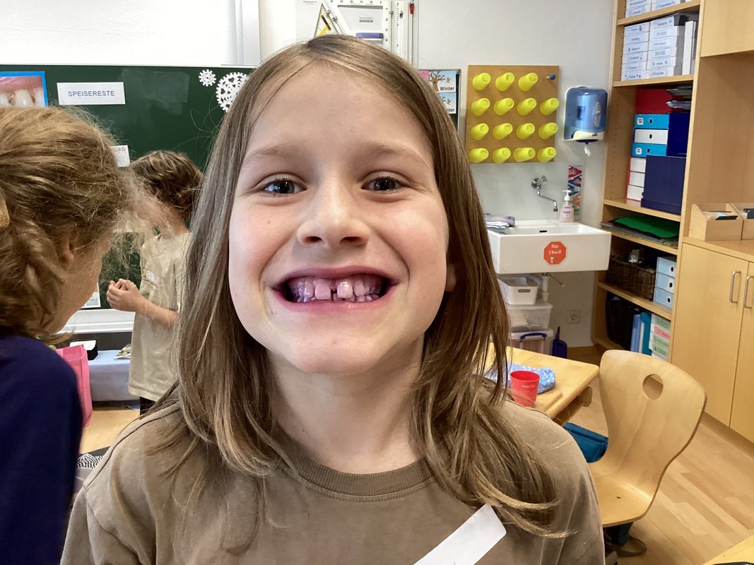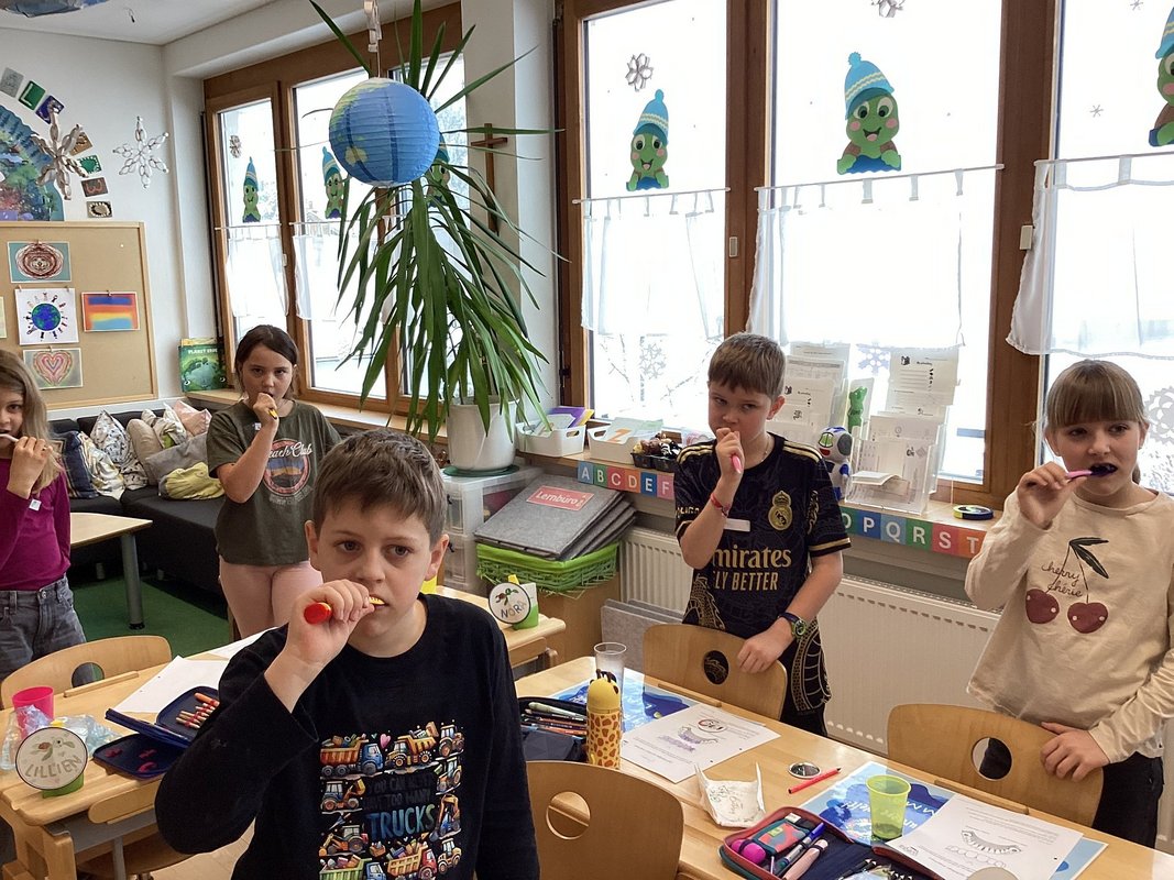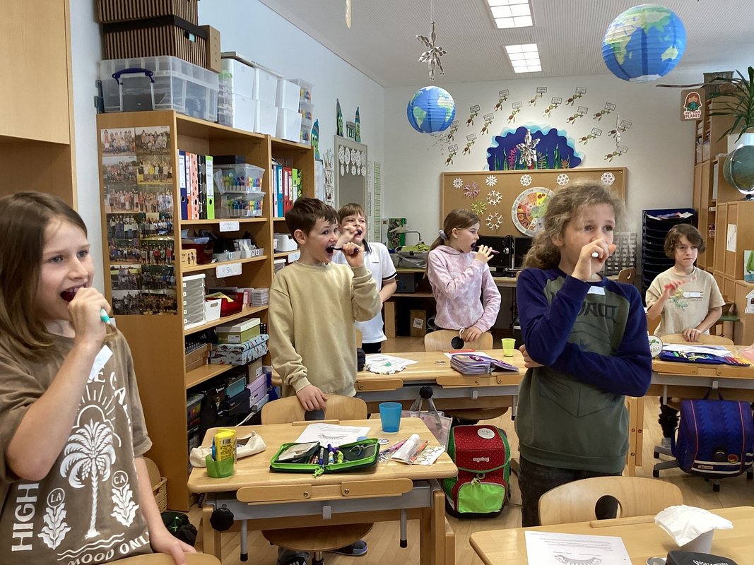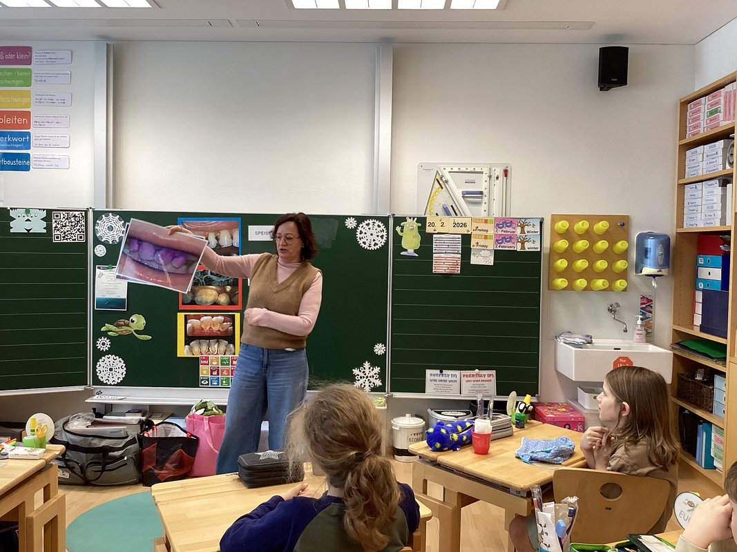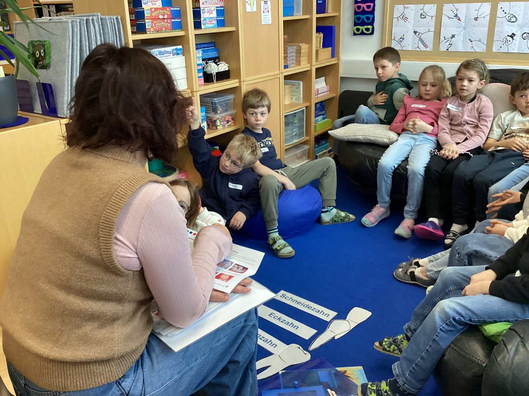 Gleich darauf kommt – ganz wunderbar – die Zahngesundheitserzieherin wie in jedem Jahr.