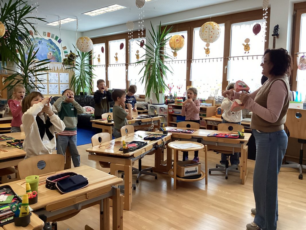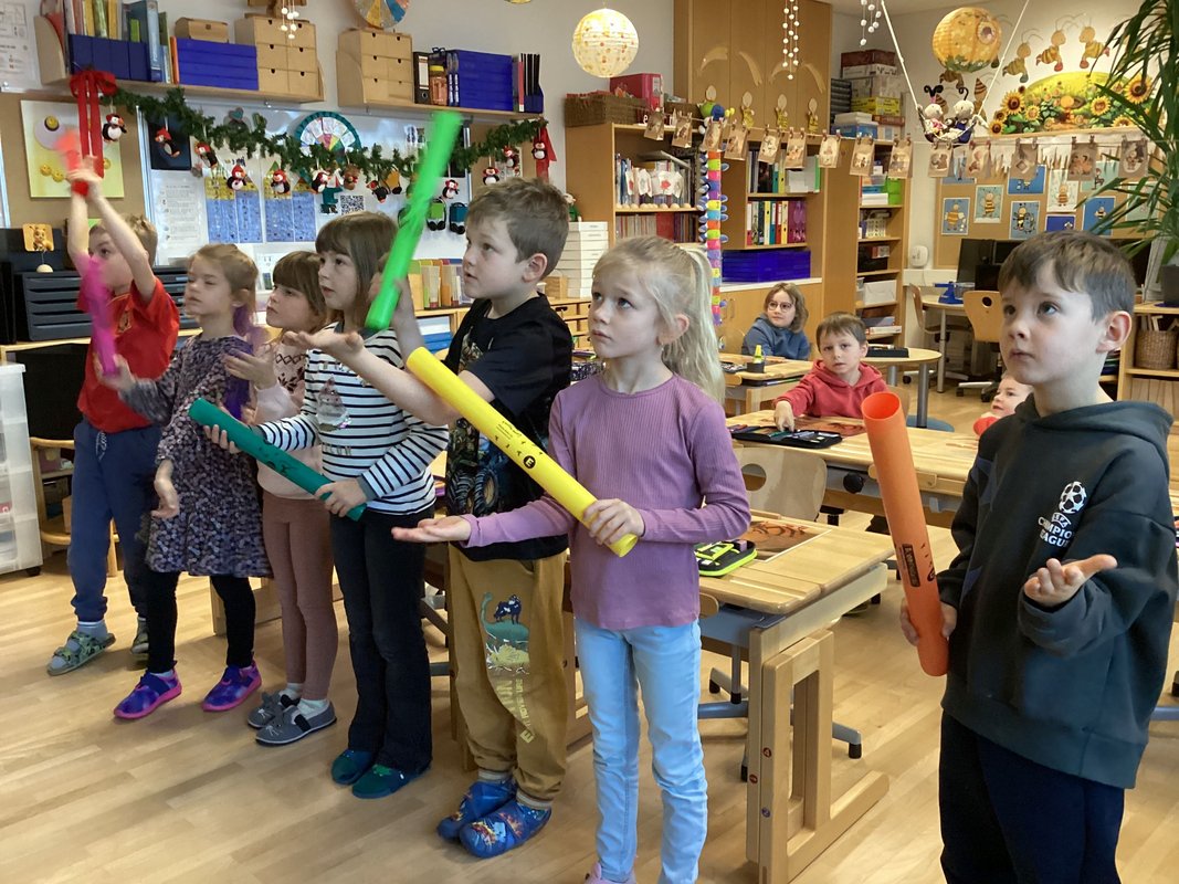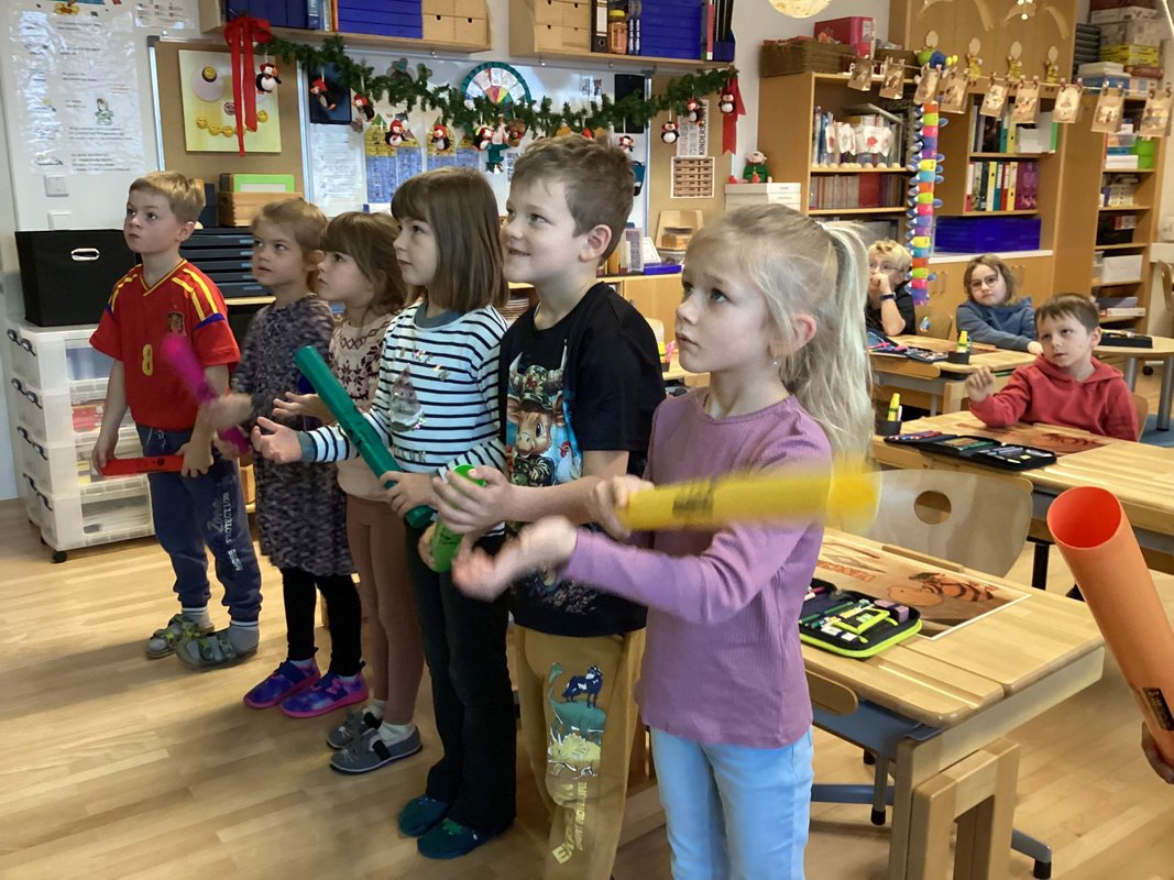 Von Zeit zu Zeit nutzen wir im Musikunterricht die bunten Boomwhacker, die meist für besonders viel Begeisterung sorgen. Die farbigen Kunststoffröhren lassen sich leicht spielen und ermöglichen uns, Rhythmen und Melodien auf spielerische Weise zu entdecken. Gemeinsam werden dann einfache Lieder begleitet, verschiedene Tonhöhen ausprobiert und rhythmische Muster eingeübt. Durch das Musizieren in der Gruppe lernen wir nicht nur musikalische Grundlagen kennen, sondern auch aufeinander zu hören und im Team zu arbeiten. Besonders spannend ist es für uns, wenn aus vielen einzelnen Tönen ein harmonisches Ganzes entsteht. Die Boomwhacker bringen Schwung in den Unterricht und machen viel Freude. Gemeinsam musizieren, kreativ sein und Neues ausprobieren.