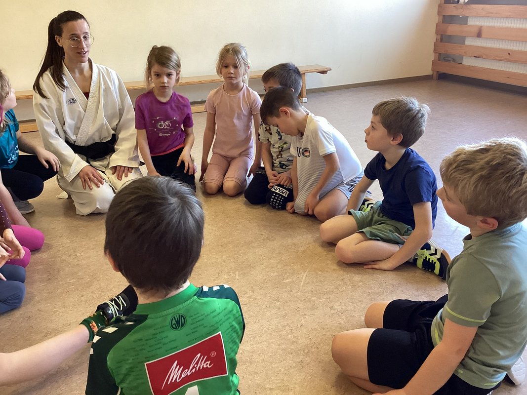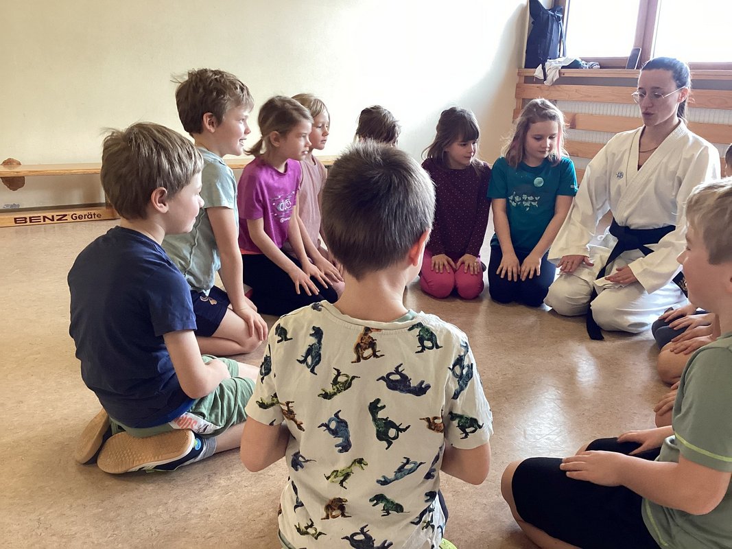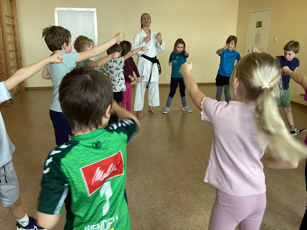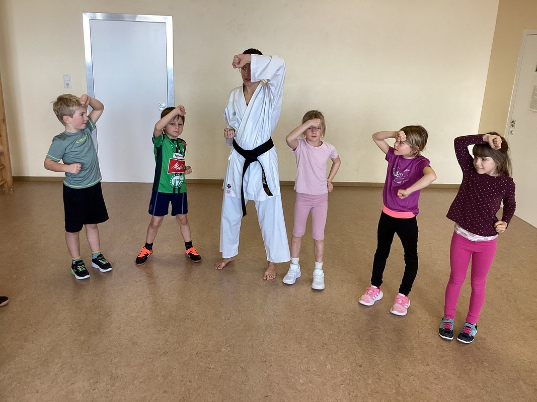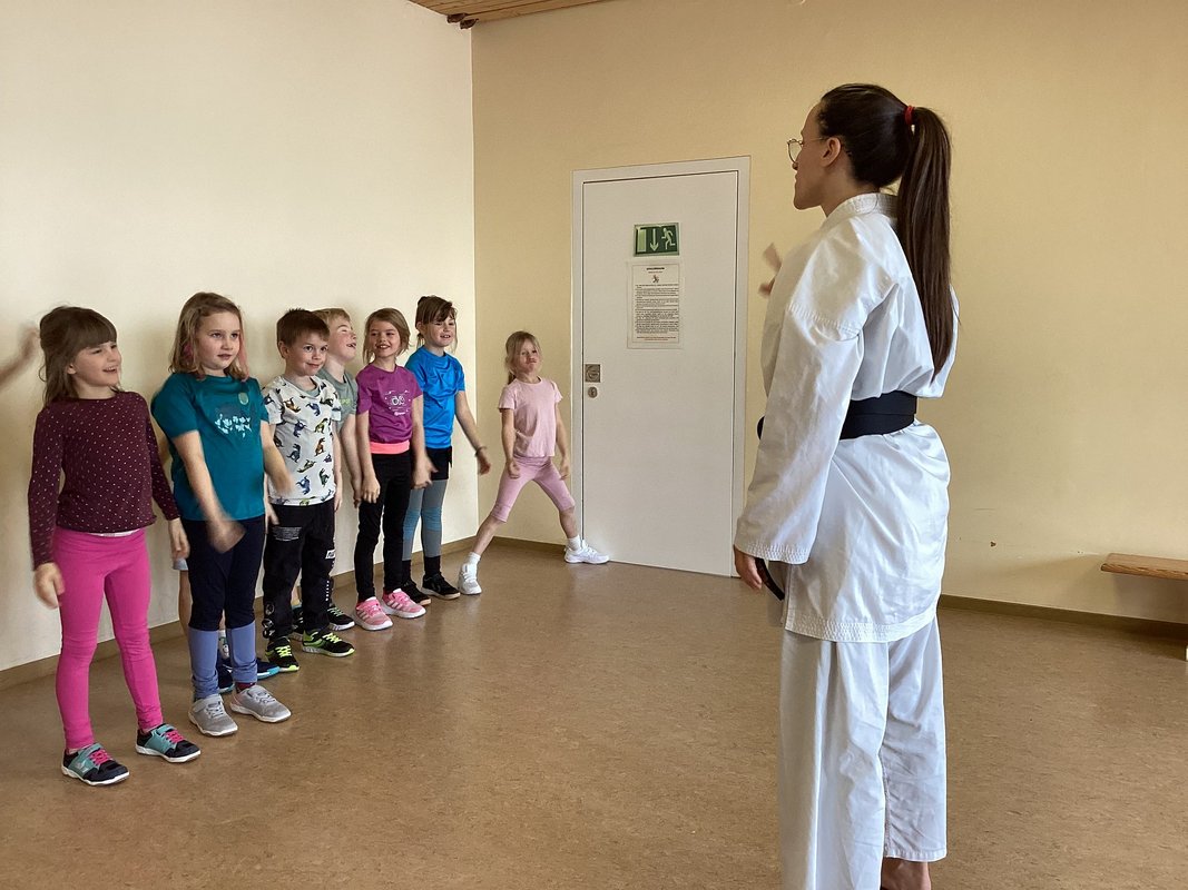 Beim Karate geht es nicht nur darum, schnell zu sein oder kräftig zuzuschlagen. Nein - wir haben gelernt, wie man sich richtig aufwärmt, wie man einfache Schritte und Abwehrbewegungen macht, wie man im Team übt, ohne sich weh zu tun und dass man sich beim Karate immer respektvoll verhält – zum Beispiel mit einer kleinen Verbeugung. Die Ruhe, die Konzentration und die gegenseitige Rücksichtnahme sind besonders wichtig im Karate. Wer gut zuhört, der kann die Übungen viel besser und selbstbewusster ausführen.