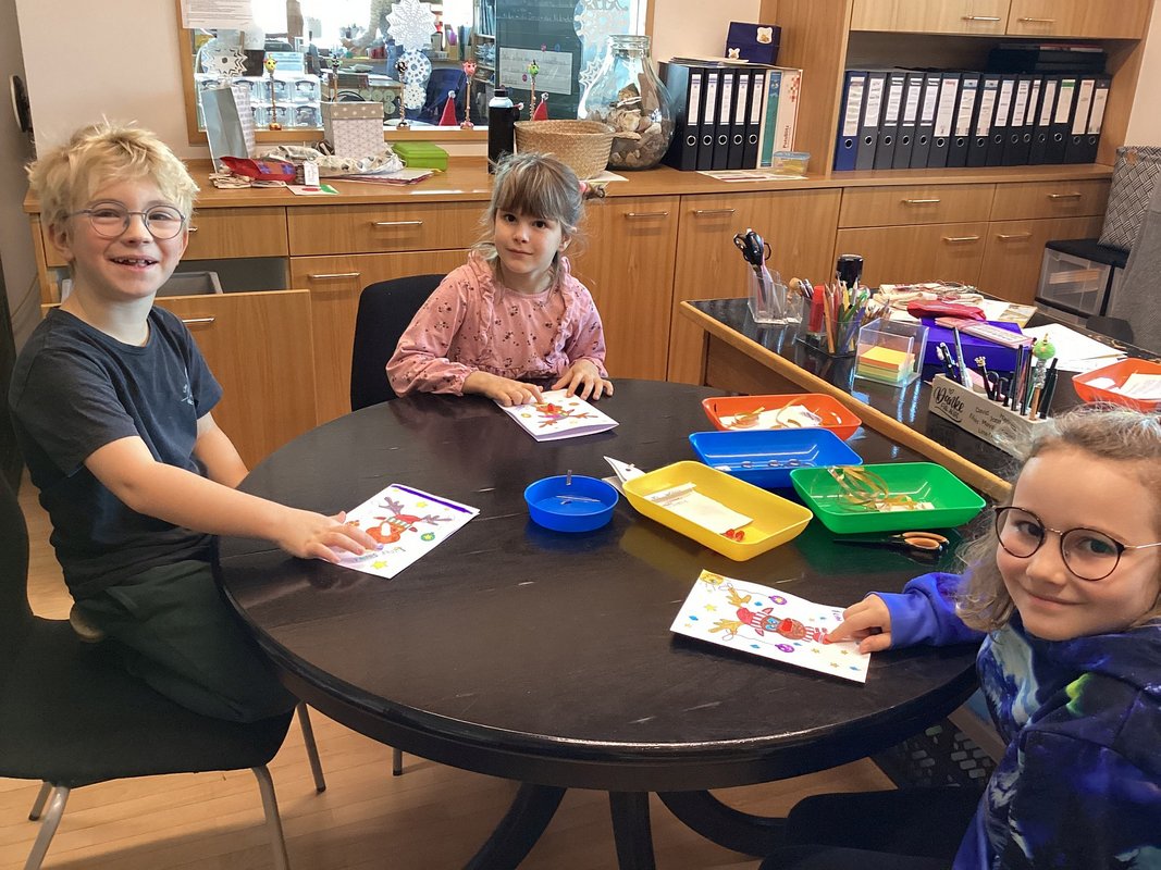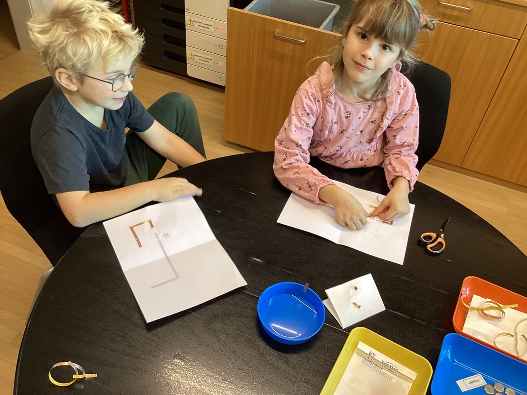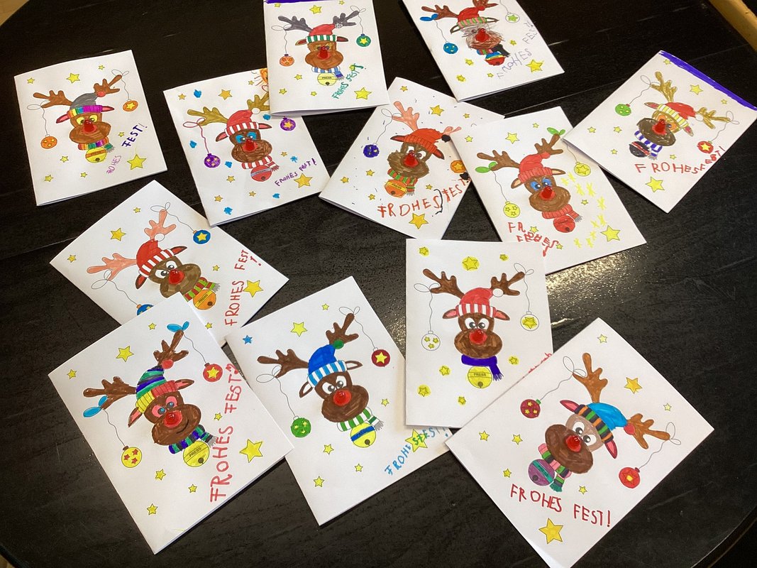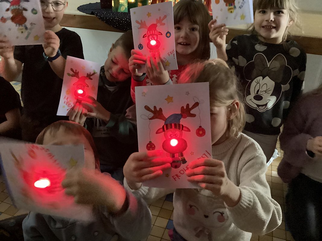 Wir probierten, drehten, klebten – und als wir die Knopfzelle schließlich zwischen das “Beinchen” der Leuchte und dem Kupferband schoben und mit Klebstreifen befestigten, schlossen wir die Karte und man konnte uns rufen hören: „Es funktioniert!“ „Schau! Meine leuchtet!“ „Rudolph hat eine rote Nase!“ Die LEDs glühten hellrot, manche blinkten sogar ein bisschen, wenn man die Knopfzelle leicht bewegte. Stolz hielten wir unsere Karten hoch – überall strahlten kleine Rudolph-Nasen wie winzige rote Weihnachtssterne. Das war ein richtig magischer Moment.