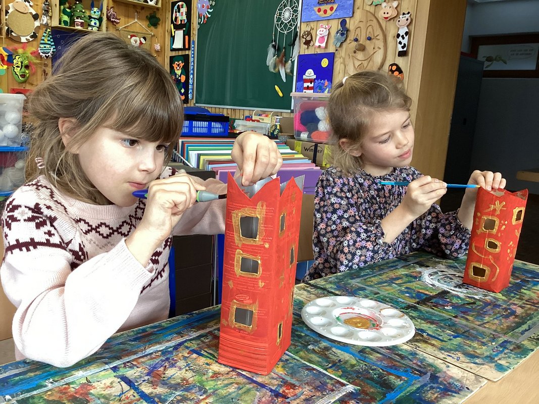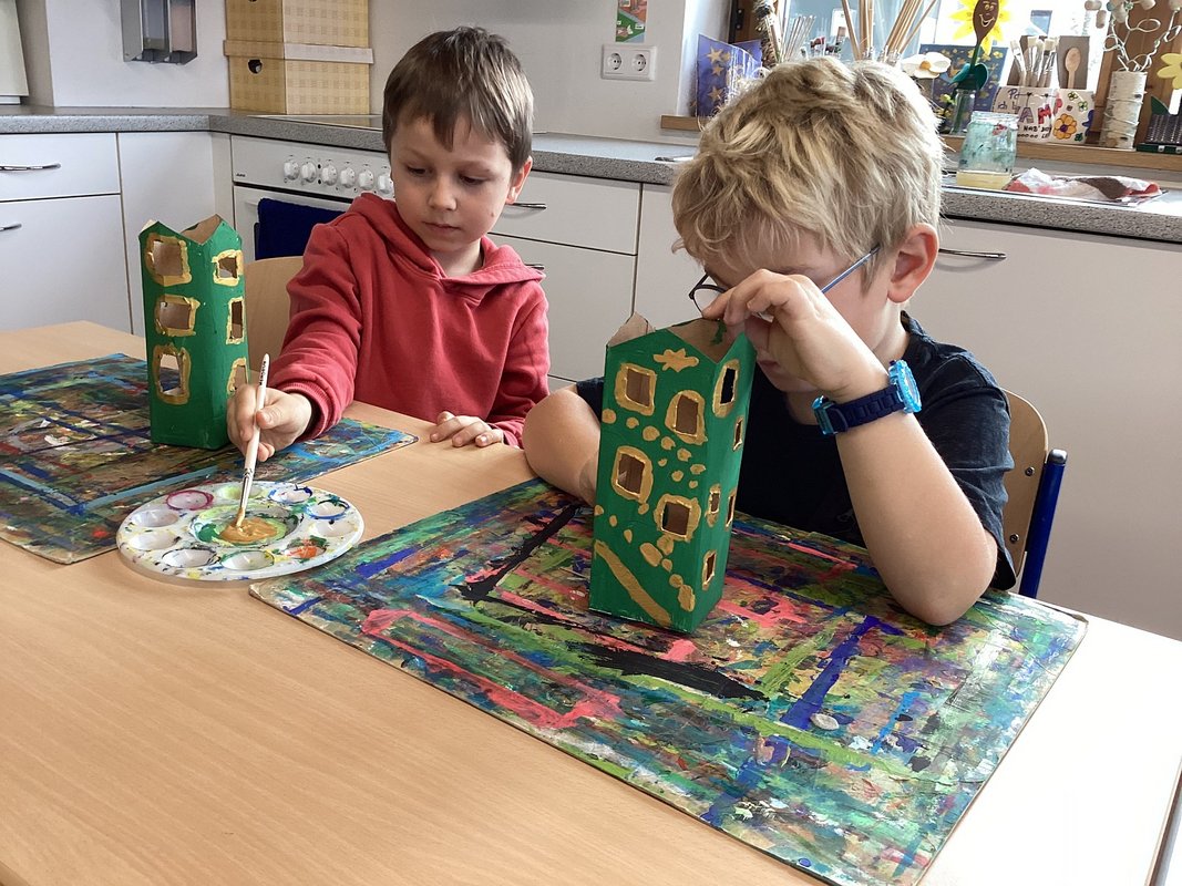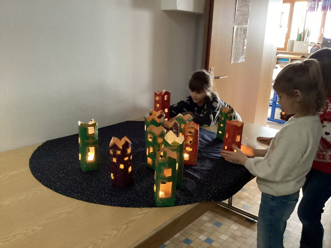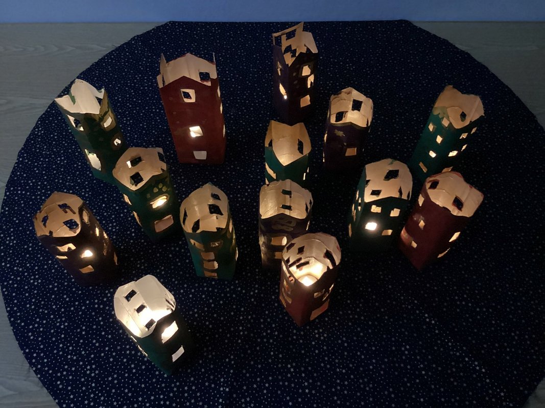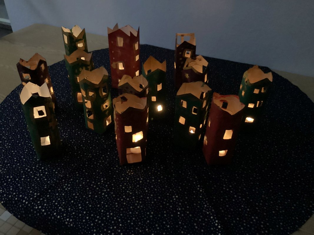 Während ich so dastand und mich funkelnd im Fenster spiegelte, bemerkte ich: Ich bin nicht allein! Zu mir gesellten sich noch mehr Milch- und Saftpackungen und sogar ein alter Tomatensaucen-Tetra Pak. Alle funkelten und strahlten genauso schön wie ich. „Willkommen im Club!“ sagte ich und wackelte mit meinem bemalten Dach. „Lasst uns alle zusammen eine Weihnachtsstadt bauen!“ Und so kamen immer mehr dazu: Jeder Tetra Pak bekam Farbe, Fenster, kleine Türen und ein warmes Licht. Gemeinsam wurden wir auf ein großes Sternenhimmeltuch gestellt. Rundherum glitzerten die goldenen Sterne darauf. Wir waren zu einer Weihnachtsstadt geworden - wohlig warm und strahlend. Abends, wenn es draußen dunkel wurde, machte jemand das Licht in uns an. Und ich hörte die Kinder sagen: „Wer hätte gedacht, dass ein alter Tetra Pak einmal so viel Weihnachtsfreude schenken kann?“