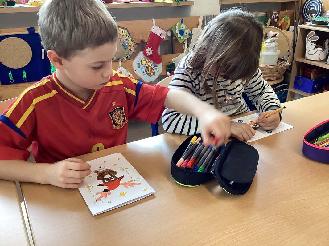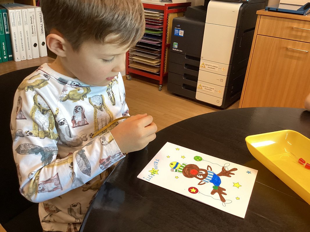 „Heute bauen wir einen richtigen Stromkreis, damit Rudolphs Nase leuchten kann!“, sagte unsere Lehrerin und zeigte uns im selben Augenblick eine Weihnachtskarte, von der wir sogleich begeistert waren. Jedes Kind bekam eine solche Karte mit Rudolph dem Rentier darauf. Rudolph lächelte freundlich – aber seine Nase war noch farblos. Doch unsere Lehrerin versprach uns, dass wir die Nase gleich zum Leuchten bringen würden. Mit bunten Stiften malten wir den niedlichen “Rudi” an: warme braune Töne, rote Mütze, Schneeflocken und Sterne drumherum. Der Werkraum verwandelte sich in ein kleines weihnachtliches Atelier.
