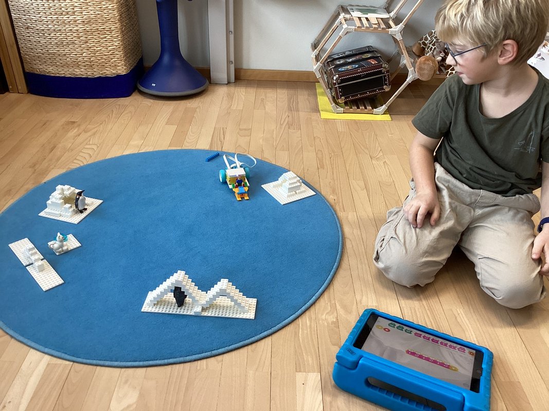 Besondere Begeisterung rief die Tatsache hervor, dass jede kleine Änderung im Programm den Roboter sofort beeinflusste. Spielerisch entwickelten die Kids ein Verständnis dafür, wie Computer «denken» und wie wichtig klare Anweisungen sind. Am Ende wurde sogar eine kleine arktische Welt erbaut, die der Roboter erfolgreich bewältigen sollte. Was für uns Erwachsene nach Technik klingt, fühlt sich für die Kinder wie ein Abenteuer an: Was passiert, wenn ich diesen Befehl ausprobiere? Warum dreht er sich jetzt plötzlich? Und wie schaffe ich es, dass er genau durch diesen Parcours fährt? Mit jeder erfolgreichen Bewegung des Roboters wuchs der Stolz. Ein “Programmierfehler” wurde nicht als Rückschlag gesehen, sondern als spannendes Rätsel: „Ich probiere es einfach nochmal anders!“ — eine Einstellung, die man sich als Lehrperson nur wünschen kann.