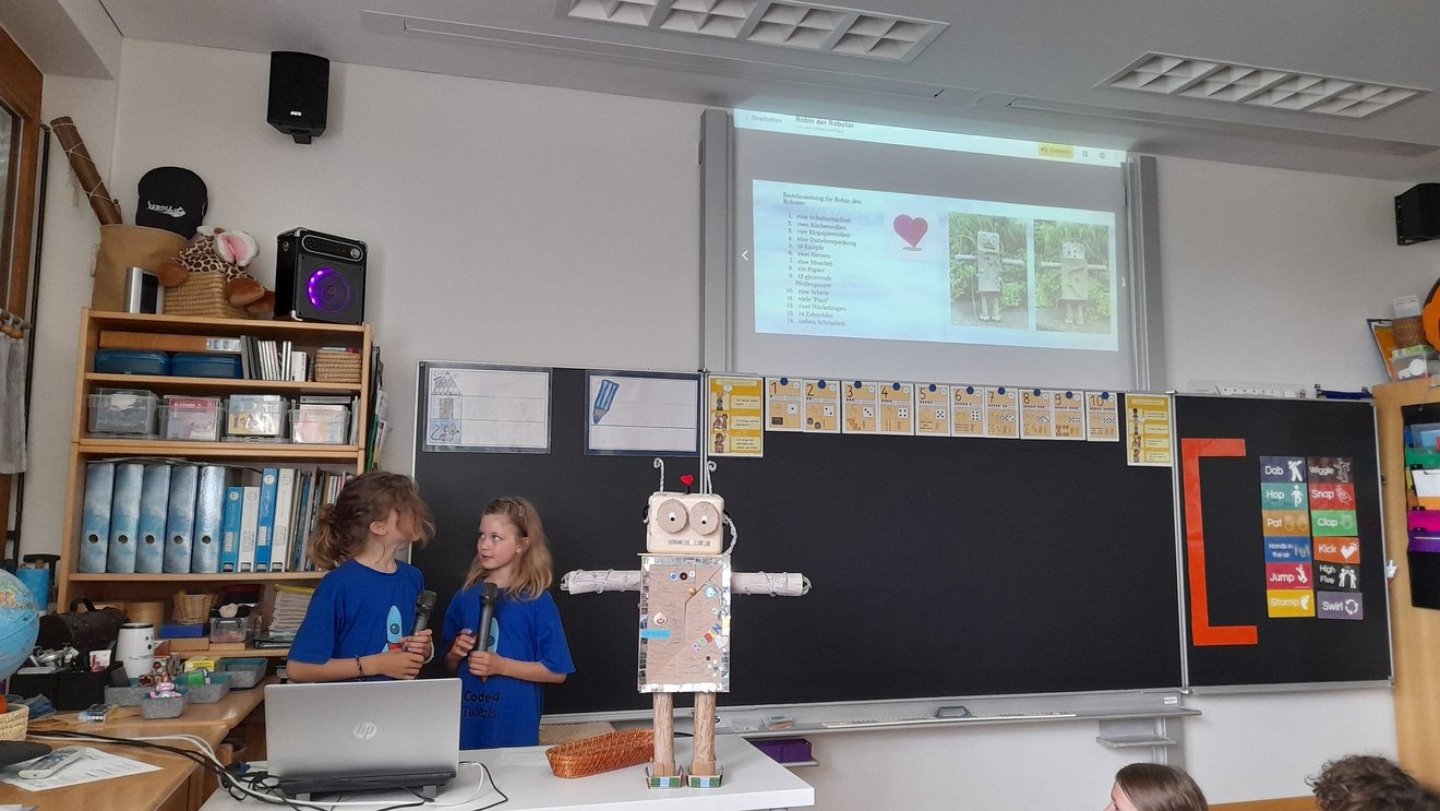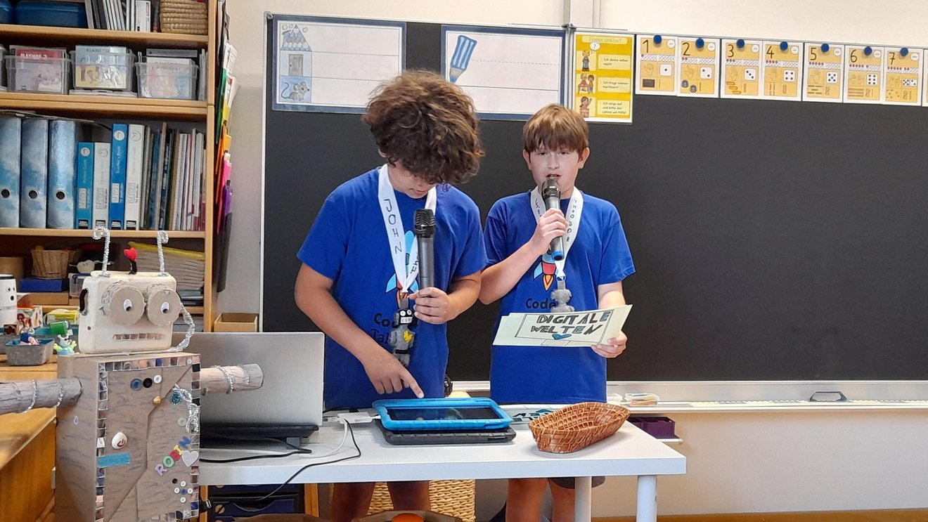 Die letzte Werkstattwoche war für uns eine "FREI DAY" - Woche. Wir durften nun all die neu erworbenen digitalen Fertigkeiten und Fähigkeiten eigenständig und kreativ umsetzen. Dabei wählten wir unsere Teams selbst, unser Thema und die Art und Weise der Umsetzung. Außerdem dachten wir uns Aufgaben für unsere Gäste aus, damit sie diese dann selbst aktiv ausprobieren konnten und wir schrieben usnere Moderationstexte für den Tag des Abschlussfestes. Durch das Programm führten unsere Viertklässler Corinna, Klara, Theodor, Ludwig, Liam und John.